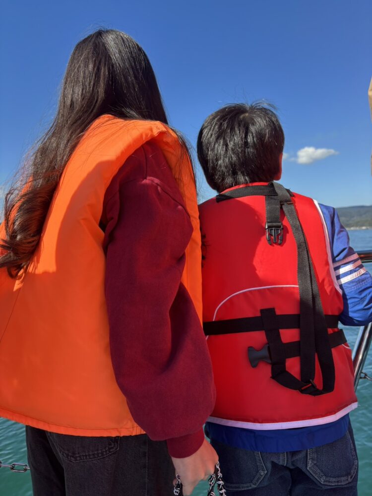 船の上から眺める景色は開放感があり、子どもたちもライフジャケット姿で、静かに海を眺めて過ごしていました。