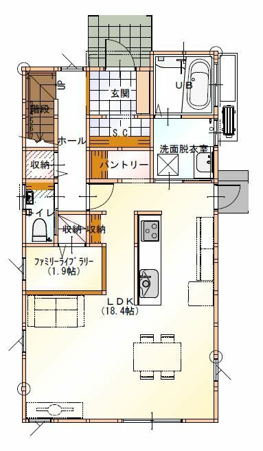 - 玄関周辺に居室以外のスペース(水回り・階段など)を集約させることで、居室面積を確保しやすい