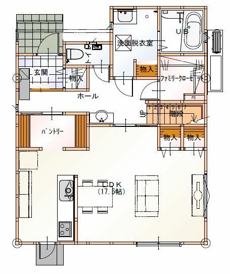 こちらは、北向きの玄関からパントリー・キッチン・リビングへスムーズにアクセスできる間取り事例です。