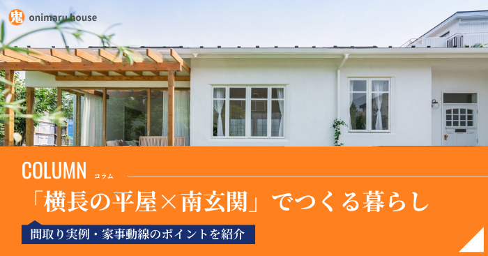 そこで今回は福岡都市圏及び北九州・山口下関エリアのハウスメーカー『鬼丸ハウス』が、多くの施工実例の中から、「横長の平屋×南玄関」の間取り実例を紹介します。
