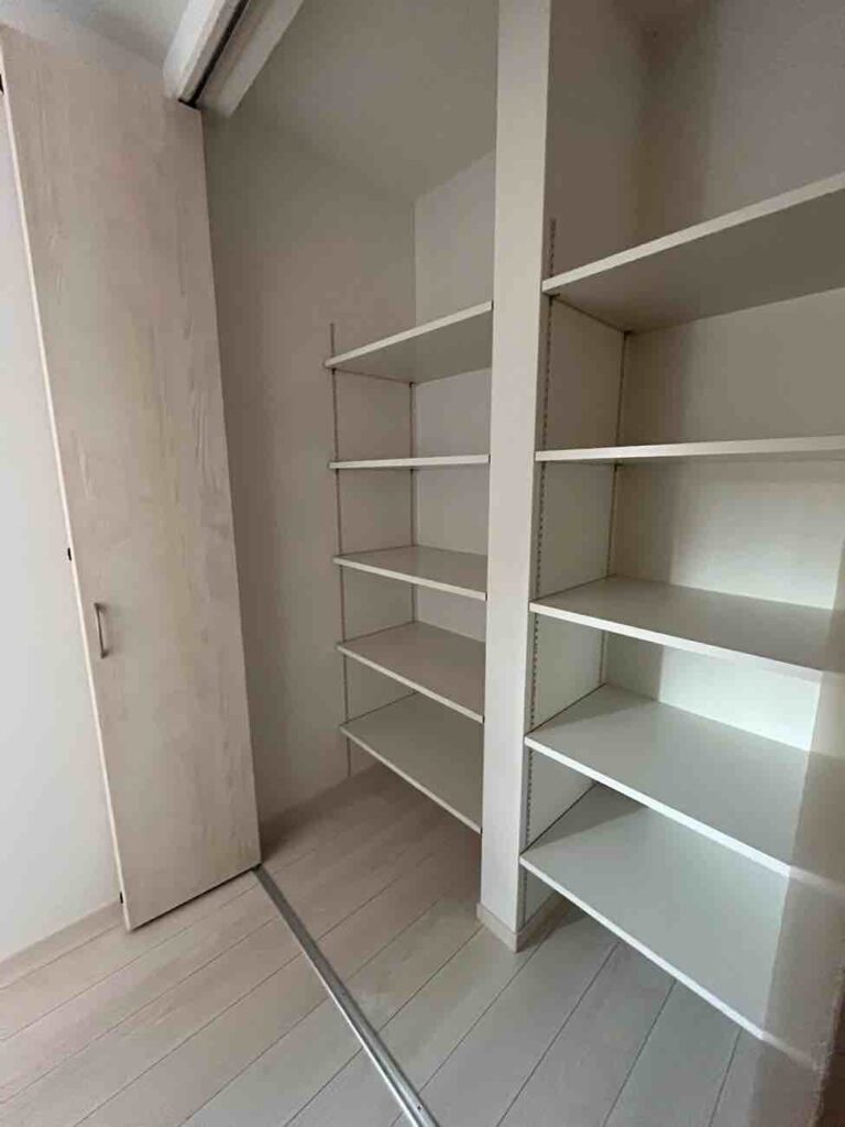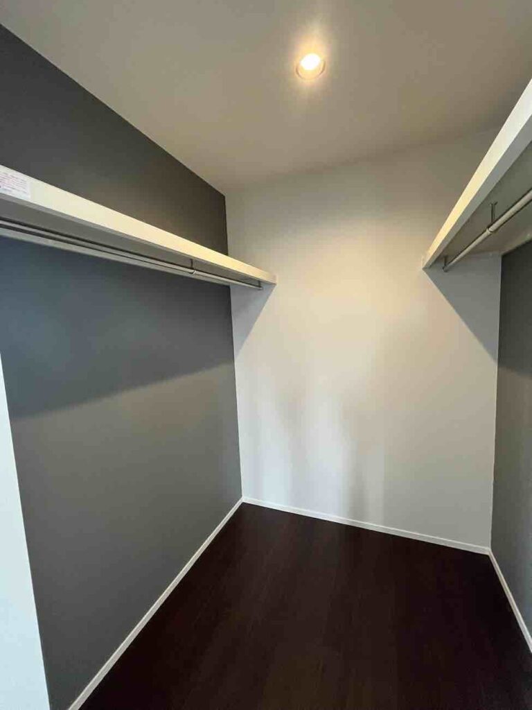 正面奥の壁は棚収納としても活用でき、衣類や雑貨を効率よく収められる構成です。