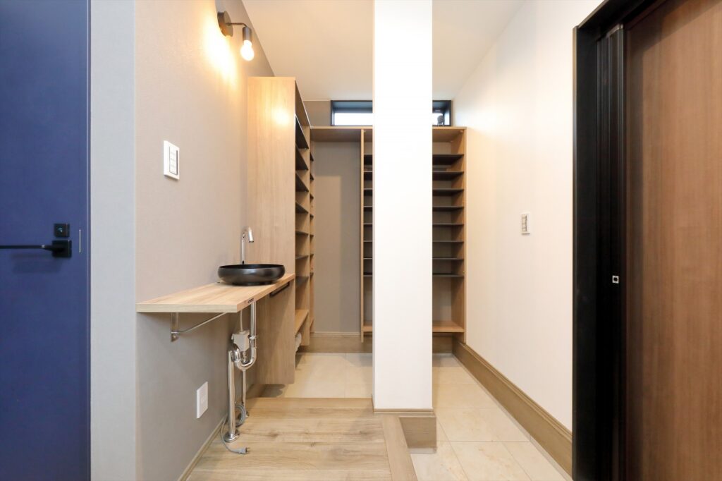 土間仕上げのパントリーにすることで、靴のまま荷物を置けますし、家庭菜園や屋外作業との相性も非常に良いです。