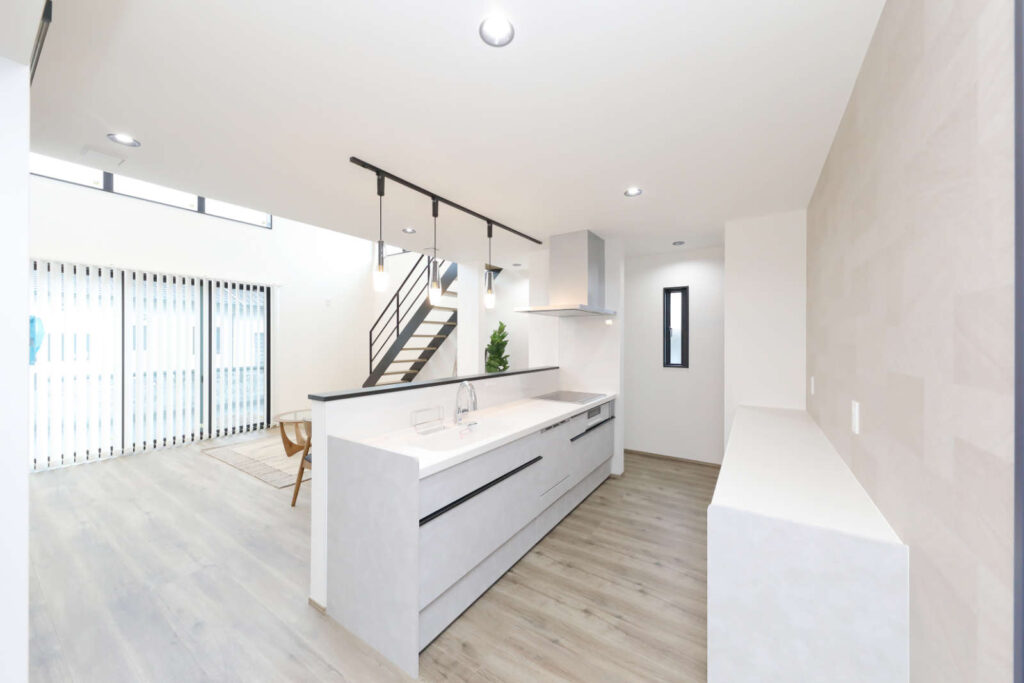 窓のサッシやキッチンのペンダントライトの黒を取り入れ、洗練されたおしゃれな印象に仕上げています。
