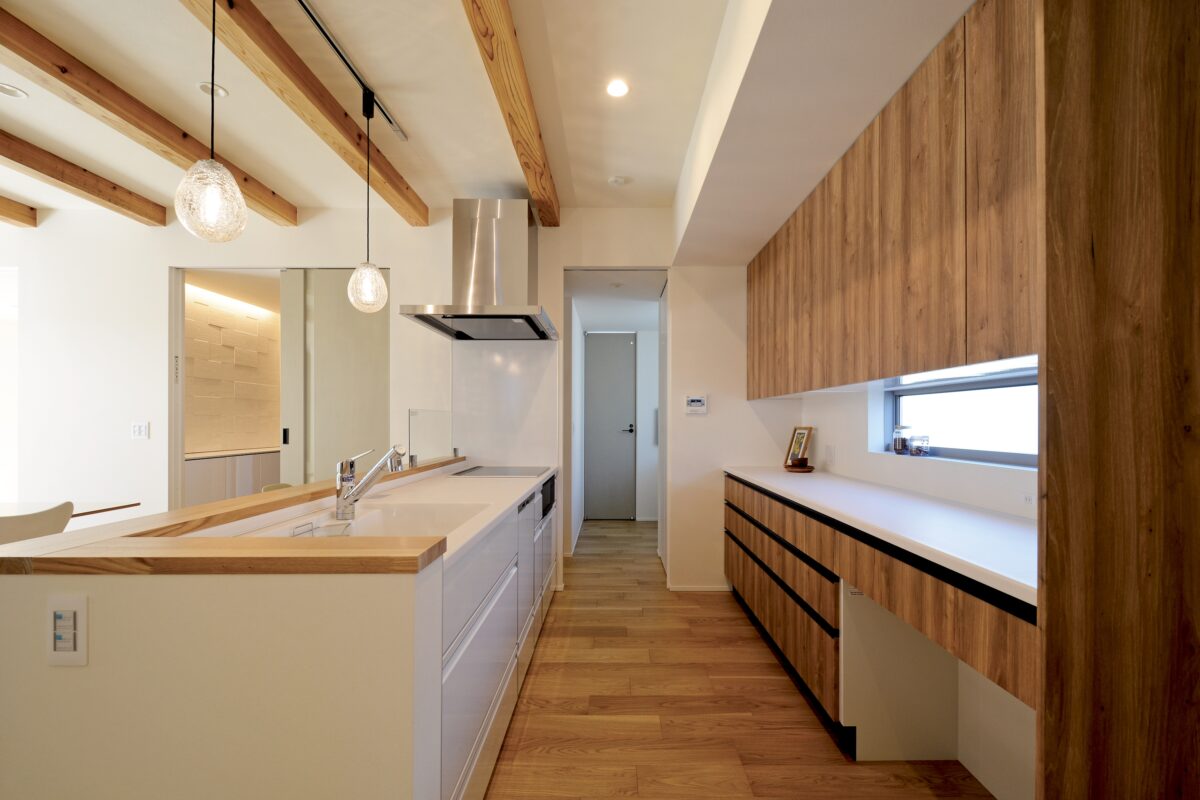キッチンからダイニングやユーティリティ(ランドリールーム)への移動がしやすく、家事の効率化を図っています